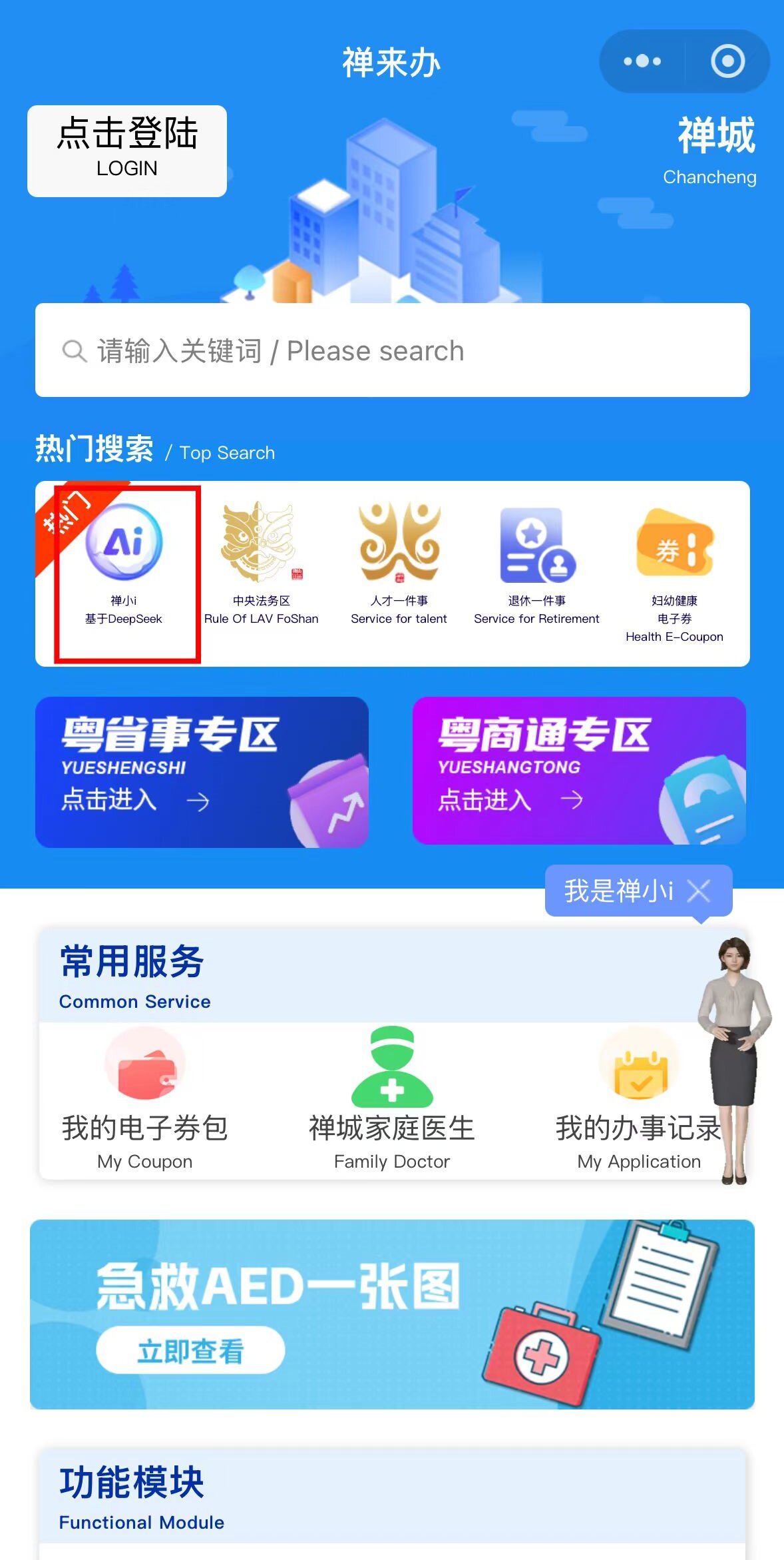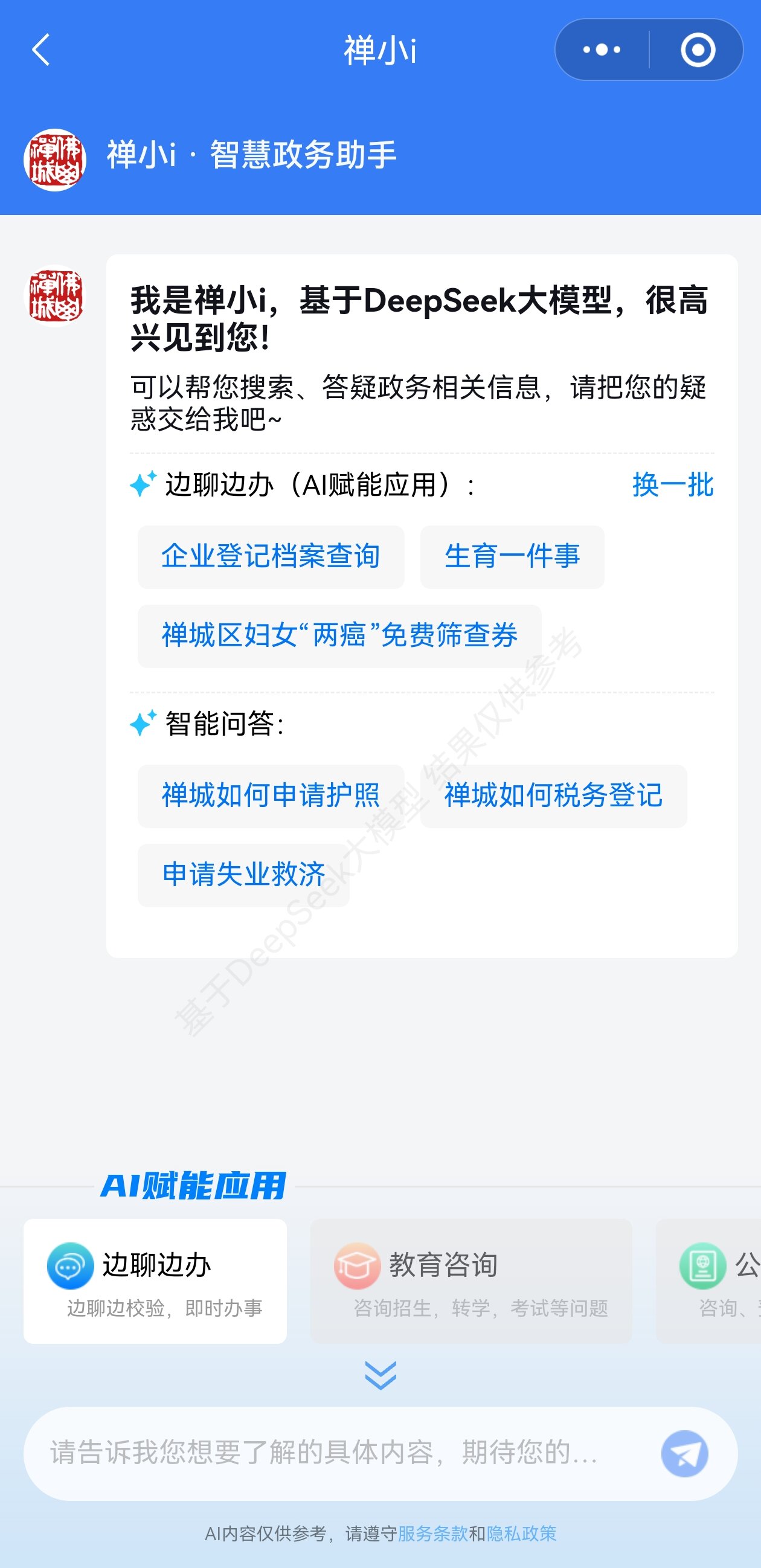 打开“禅来办”微信小程序,点击“禅小i”进入聊天界面,输入办理事项需求或点击按钮,即可开启“边聊边办”体验。