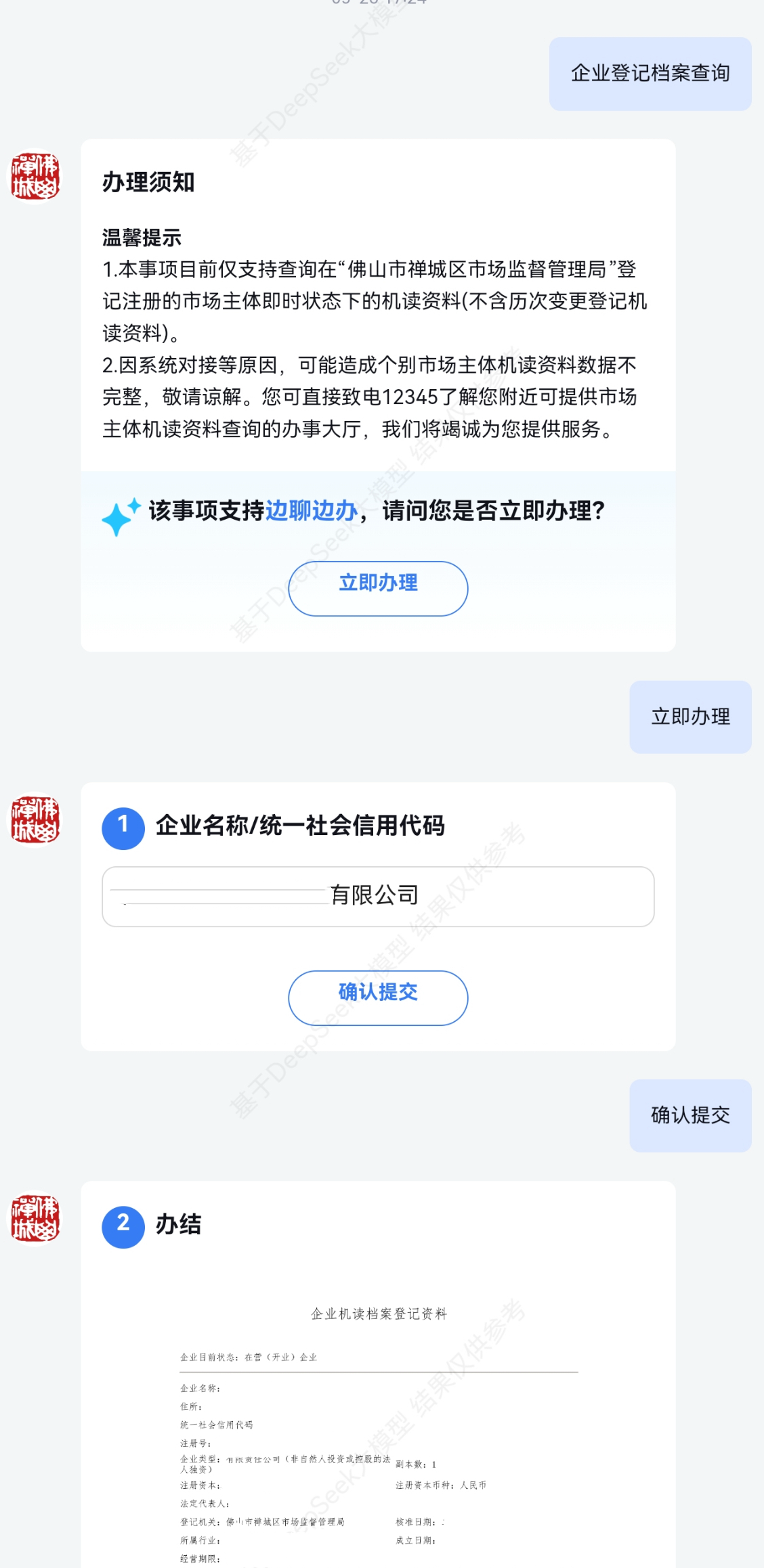 以“企业登记档案查询”为例,办事人只需输入“我想办企业登记档案查询”,“禅小i”便会即时引导办事人输入企业名称或统一社会信用代码,秒速生成查询结果,指引清晰、操作简单。